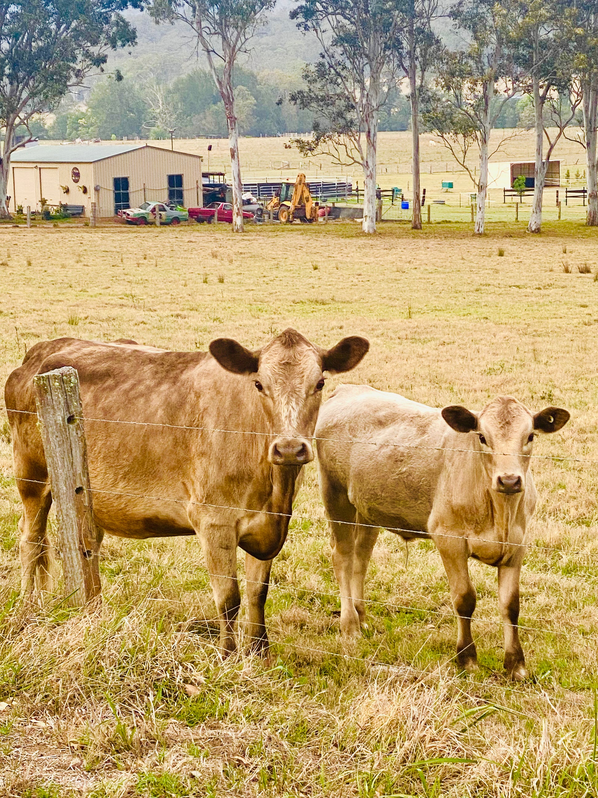 "Country Companions" is a charming Fine Art Photograph featuring two cows standing in a serene rural farm, gently gazing at the viewer with quiet, endearing curiosity. Their calm presence, set against a backdrop of farm machinery and a shed, captures the peaceful simplicity and timeless charm of rural life.