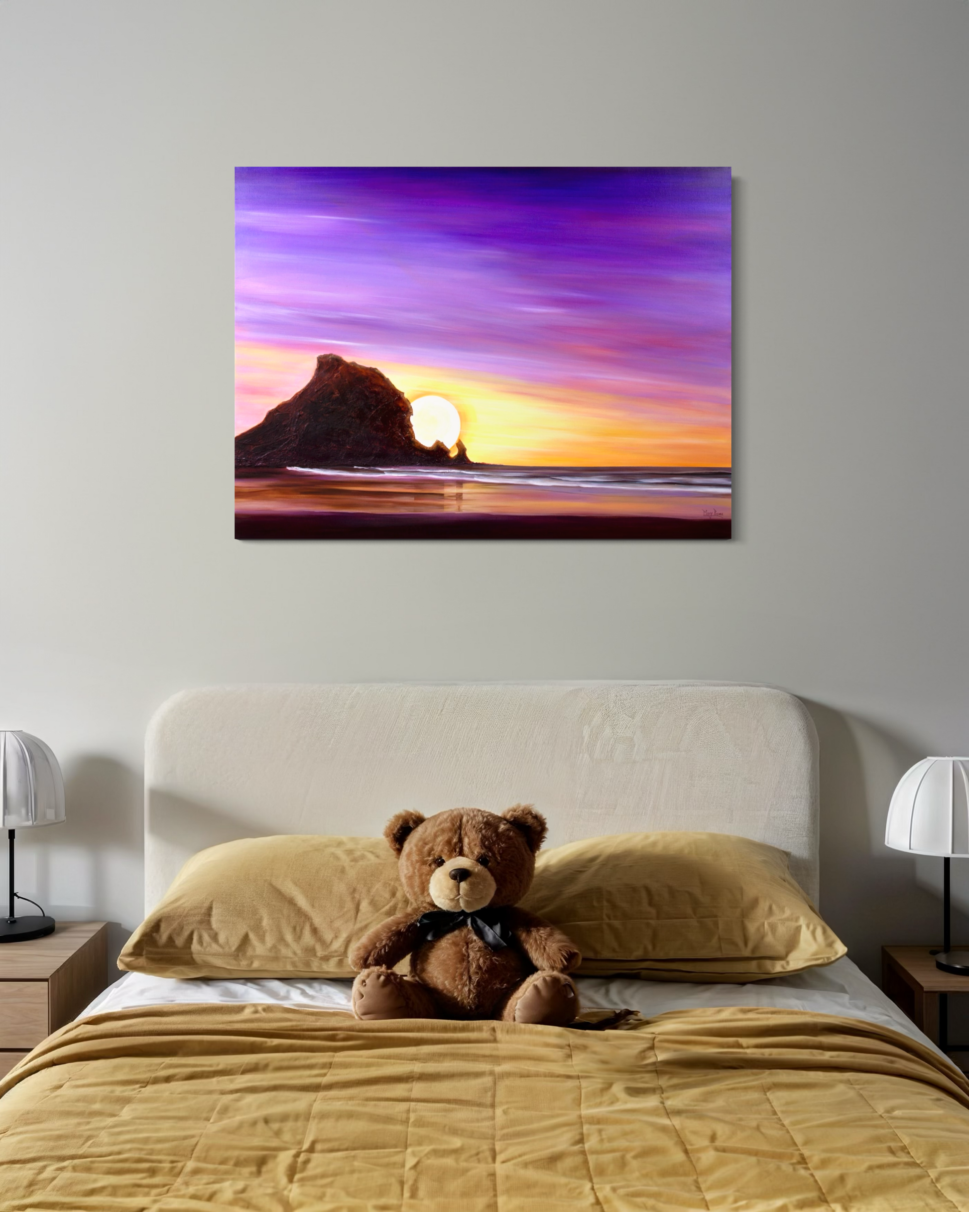 "Whispers of Heaven" captures the awe of a stunning sunset as it unfolds across the beach. Rich shades of purple, pink, and maroon merge with warm hues of yellow and orange, casting a radiant glow over the sky.