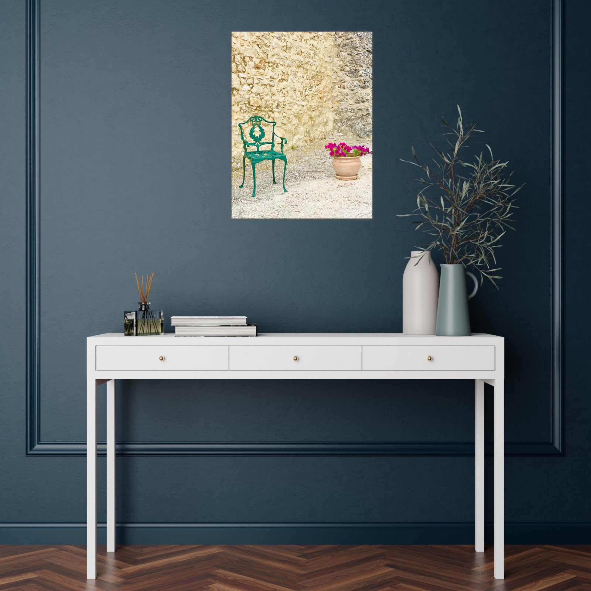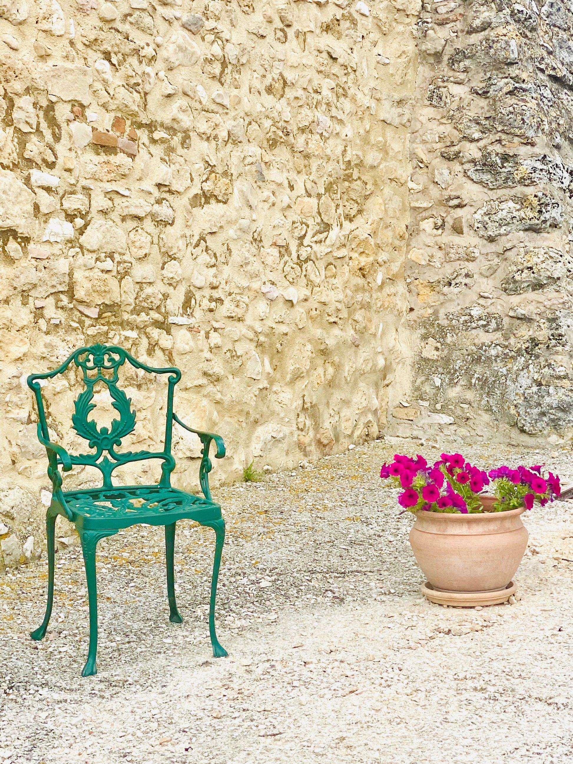 As I walked down the street, I found myself drawn to this quiet scene, captivated by the simplicity it exuded. The calm and stillness it evoked stopped me in my tracks, compelling me to capture the moment. A solitary green chair sat beside an earthen pot with delicate pink blooms, resting on a weathered stone path. The stone wall in the background exuded tranquility, with soft hues of beige, grey, and white, evoking a sense of history and quiet reflection.